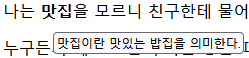 <p>나는 맛집을 모르니 친구한테 물어봐야겠다.</p>