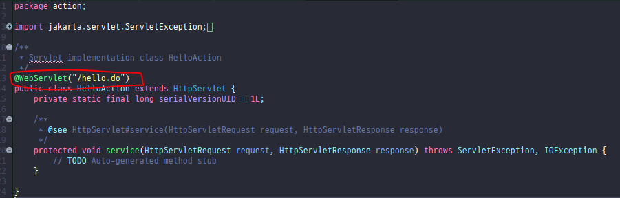 @WebServlet("/hello.do") 어노테이션 해당 위치에 넣기