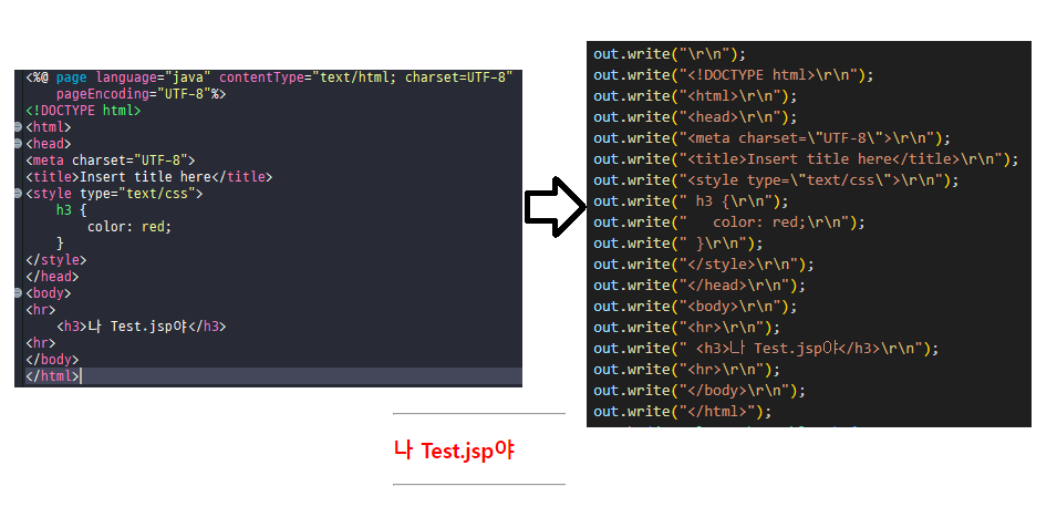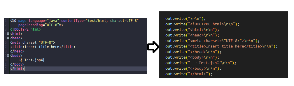 - JSP에서 만든 html 형식의 문서가 Test_jsp.java 프로그램 안에서 전부 Servlet 형식으로 바꿔주고 있었다.